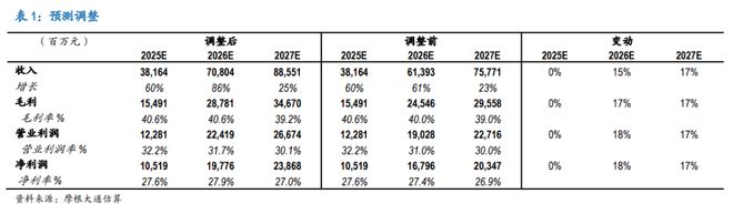 摩根大通预计,中际旭创2025-2027年销售额/盈利年复合增长率分别为55%/66%。值得注意的是,摩根大通对毛利率的预测相对保守,约为40%,这为盈利预测提供了潜在上行空间。